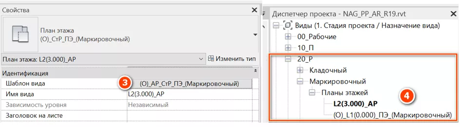 При этом будут созданы новые виды, к которым уже применены соответствующие шаблоны видов [3], и они автоматически появятся в нужной группе в диспетчере проекта [4] (см. Рисунок 101):