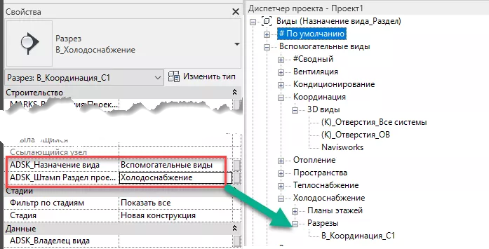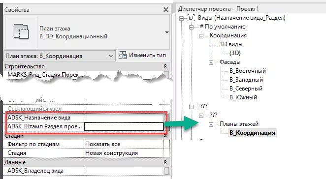 Чтобы разнести эти виды по нужным группам или создать новую группу, нужно заполнить параметры «ADSK_Назначение вида», «ADSK_Штамп Раздел проекта», Рис. 6 - Назначение группы.