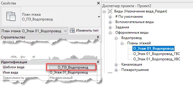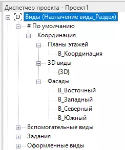 В шаблонах настроены и используются несколько типов организации видов в диспетчере проектов. По умолчанию применяется способ организации видов «Назначение вида_Раздел», Рис. 3 - Организация видов.