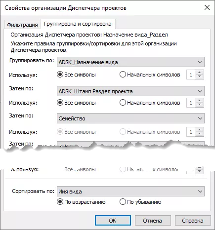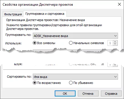 При таком способе организации, виды сначала группируются ADSK_Назначение вида, а затем по ADSK_Штамп Раздел проекта. Сортировка происходит по параметру Имя вида, Рис. 4 - Группировка и сортировка видов.