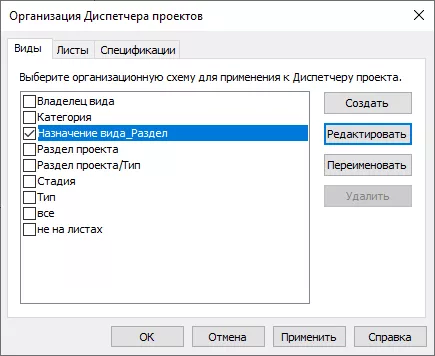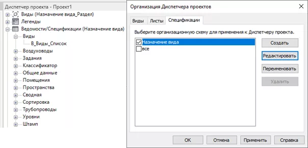 В шаблонах настроена и используются организация спецификаций в диспетчере проекта «Назначение вида», Рис. 9 - Диспетчер проекта. Организация спецификаций.