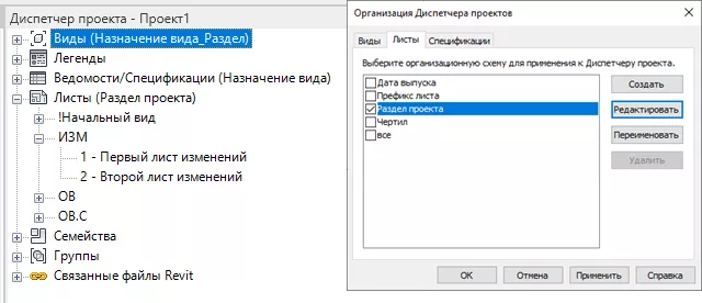 В шаблонах настроено и используются несколько типов организации листов в диспетчере проекта. По умолчанию применяется способ организации листов «Раздел проекта», Рис. 7 - Диспетчер проекта. Организация листов.