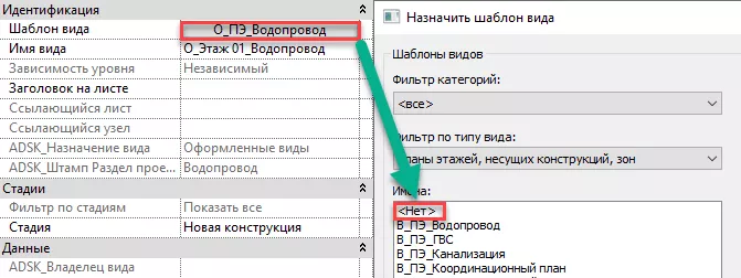 Чтобы отключить шаблон от вида, нужно нажать на шаблон в параметре «Шаблон вида» и выбрать «<Нет>» в появившемся окне, Рис. 14 - Отключить шаблон.