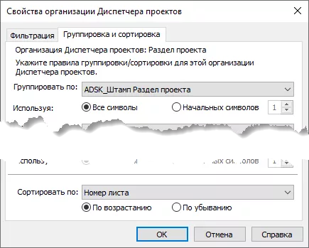 При таком способе организации, листы группируются по ADSK_Штамп Раздел проекта, сортировка происходит по параметру Номер листа, Рис. 8 - Группировка и сортировка листов.