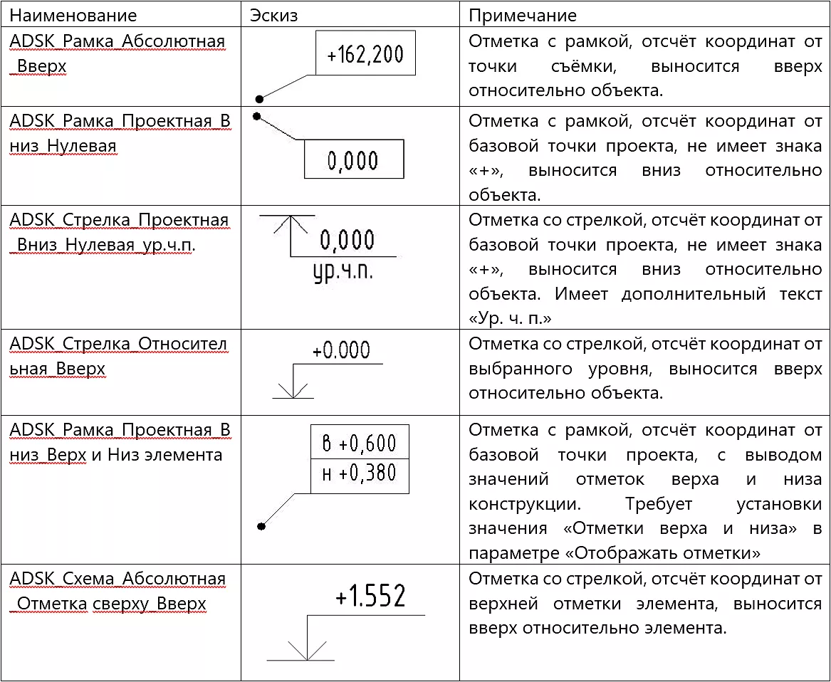 Классификация отметок отражается в наименовании. Некоторые типы высотных отметок приводятся в Таблица 1 - Высотные отметки.