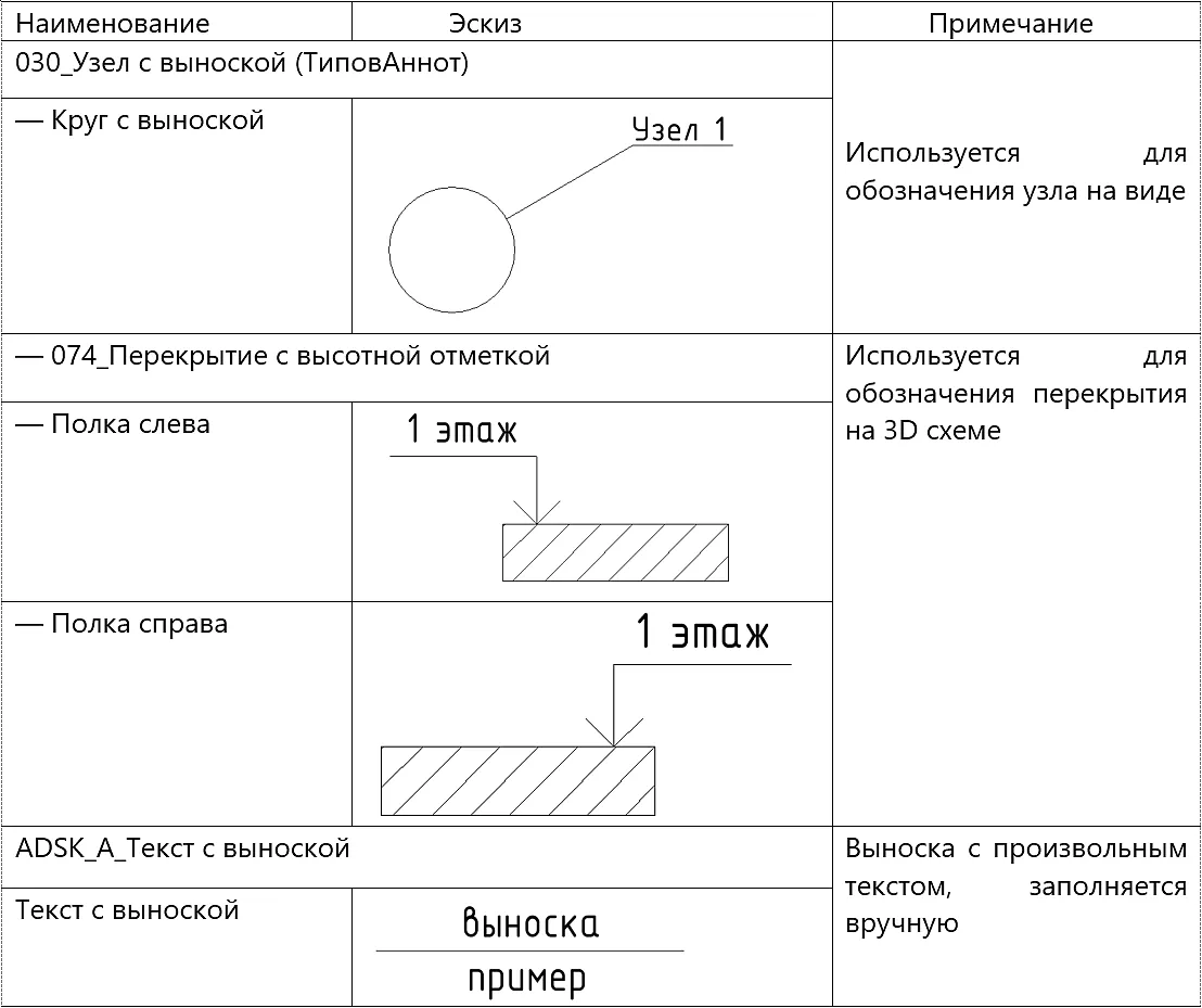 Типовые аннотации предназначены для нанесения обозначений, не связанных с элементами модели (в отличие от марок) и размещаются с помощью команды «Обозначение» на вкладке «Аннотации», Таблица 2 - Типовые аннотации.
