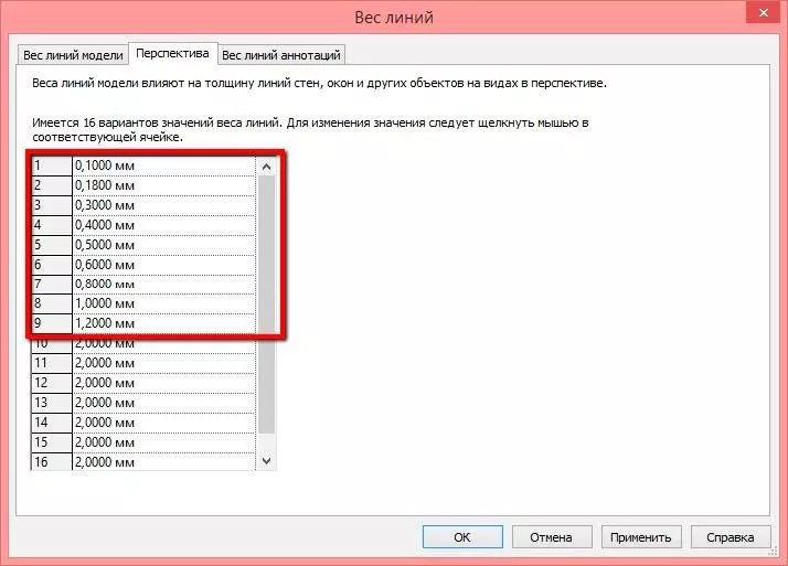 Для отображения элементов модели на перспективных видах используются веса линий из вкладки «Перспектива». Веса №1 - 9 используются для элементов модели, и эти же веса (указанные в меню «Стили объекта» или «Переопределение видимости / графики» для линий «Проекции») используются для отображения объектов в перспективе, Рис. 27 - Вес линий в перспективе.