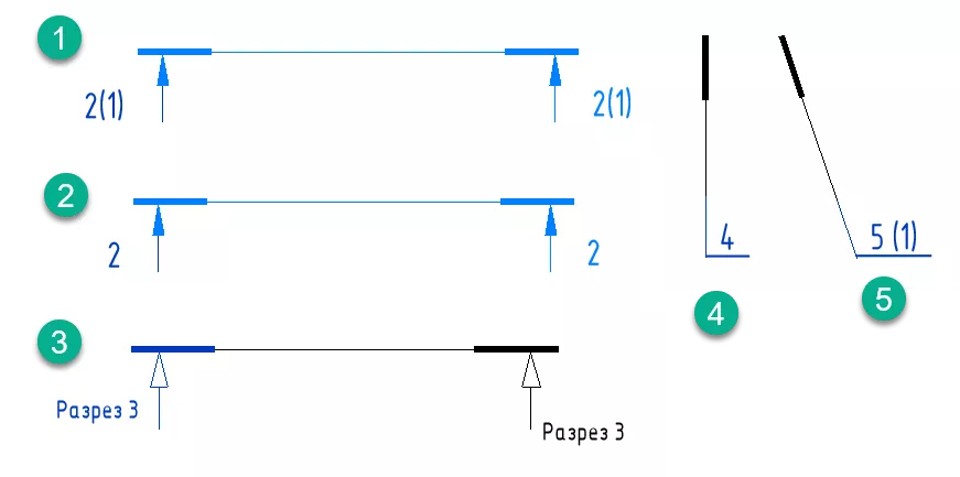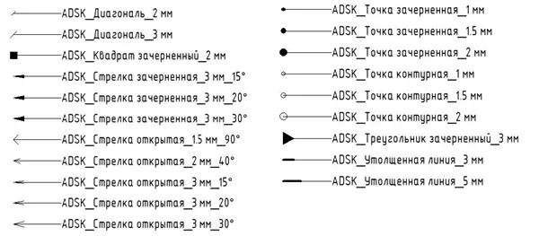 Как компонент размеров и выносок, в шаблонах настроены необходимые типы засечек, Рис. 33 - Типы засечек.