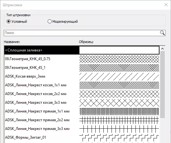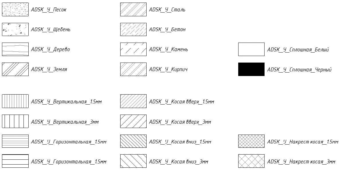 Условные штриховки разделены на смысловые группы, для облегчения поиска. Например, все «основные» (генерируемые в Revit) штриховки имеют общий префикс «ADSK_Линия_...», Рис. 23 - Штриховки.