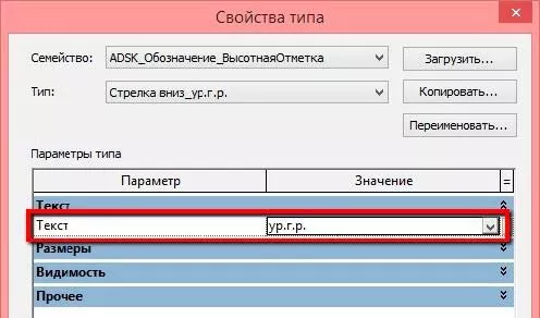 При необходимости добавить собственный дополнительный текст к марке (например, «ур. г.р.» - уровень головки рельса), вы должны создать новый типоразмер аннотационного обозначения «ADSK_Обозначение_ВысотнаяОтметка» и откорректировать его параметры (вписать нужный текст в параметр «Текст»), Рис. 34 - Типоразмер аннотации.