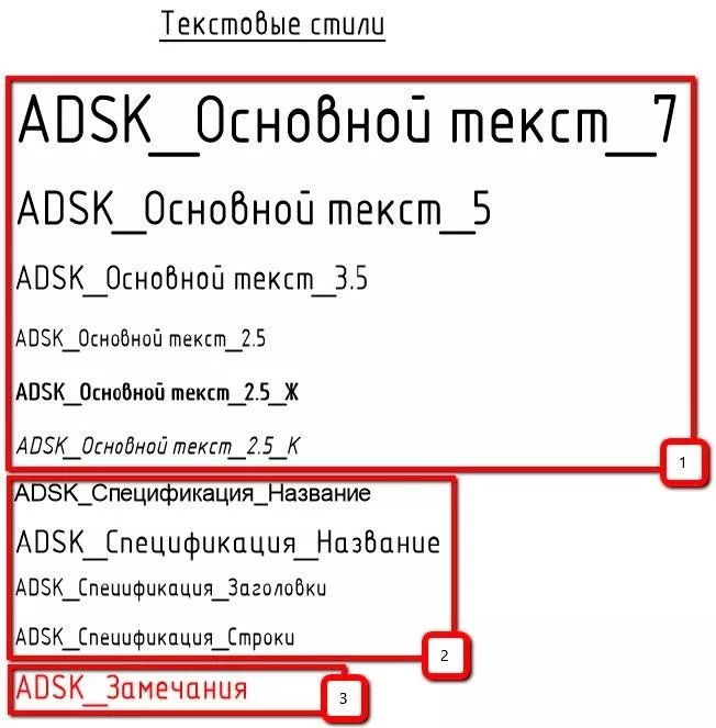 - Основной текстовый стиль для оформления документации - «ADSK_Основной текст_2.5» - именно такие настройки выполнены для основных типов размеров, марок, строк спецификаций. Также в проектах могут использоваться другие текстовые стили с высотой текста 3.5...7 мм, жирные, курсивные и проч.