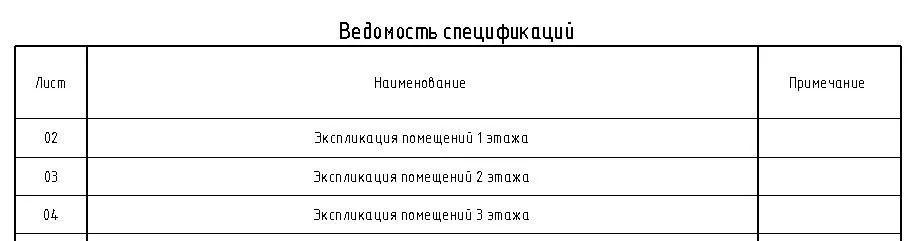 Ведомость спецификаций создается на основе спецификации «О_Ведомость спецификаций», которая представляет собой спецификацию, заполняемую вручную, Рис. 48 - Ведомость спецификаций.