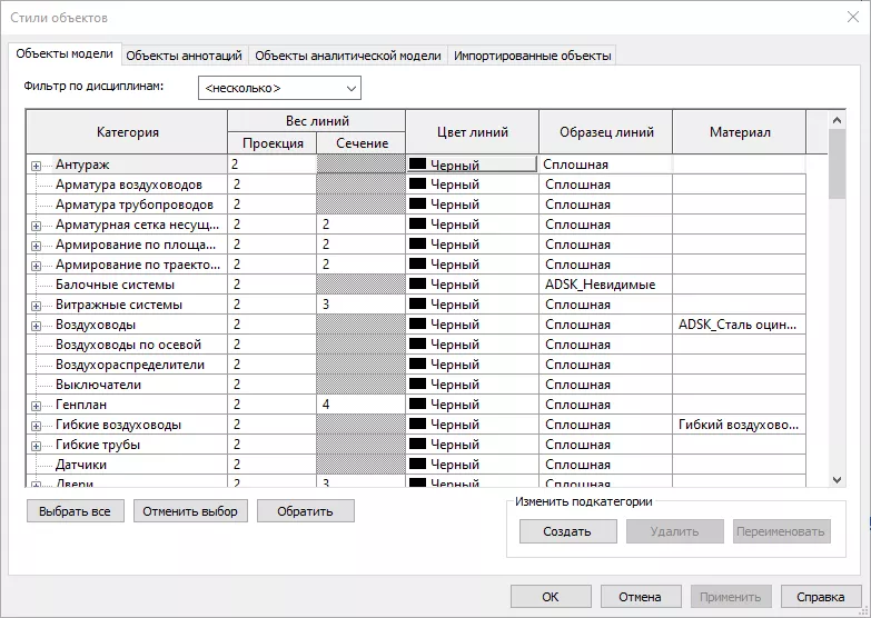 Настройки типа [2] «ADSK_Все категории…» используют индивидуальный слой для каждой подкатегории.