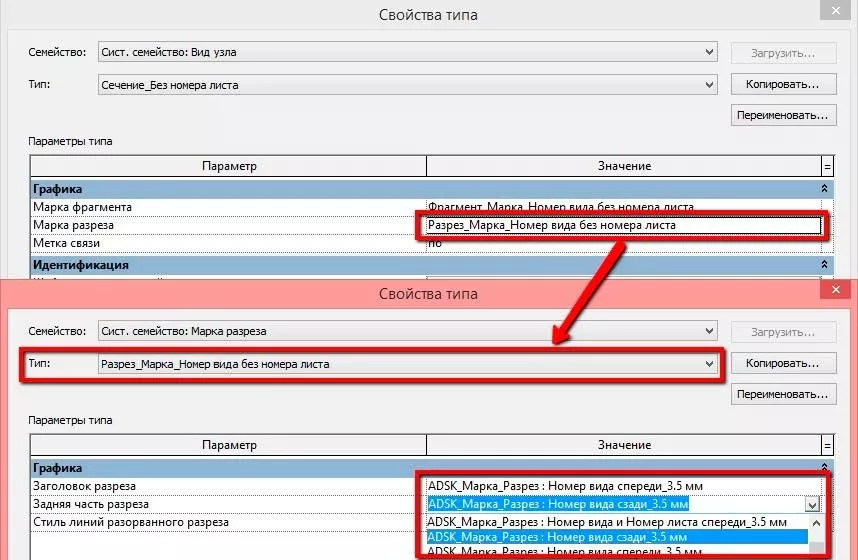 Таким образом вы можете выбрать номер вида с листом или без листа, спереди и сзади для первой марки (Заголовок разреза) и для второй марки (Задняя часть разреза).