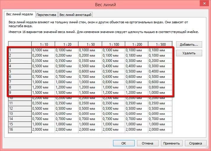 Для отображения элементов модели на планах, разрезах, фасадах, 3D (не на перспективе!) используются веса линий из вкладки «Веса линий модели».