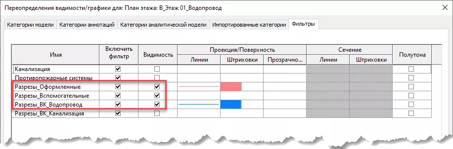 Разрез или сечение в названии имеют дисциплину, например ADSK_ВК_В_Канализация, следовательно если построить разрез ADSK_ВК_В_Канализация на виде не для своей дисциплины, например Водопровод, данный разрез виден не будет! Данный метод работы организован через фильтры на видах, Рис. 39 - Фильтры на видах.