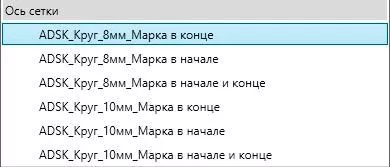 В шаблонах настроены несколько типоразмеров осей, с разным расположением и диаметром марки, Рис. 50 - Типоразмеры осей.