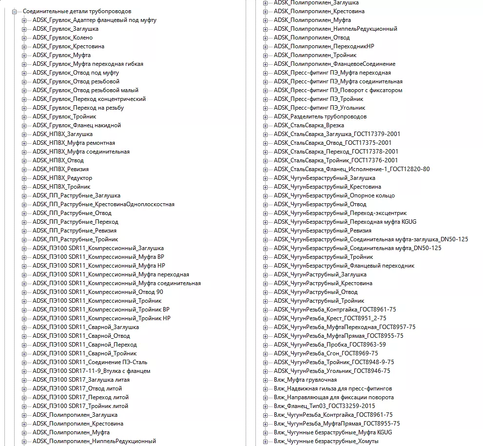 Для настроенных типов трубопроводов загружены соединительные детали по типам, Рис. 93 - Семейства деталей трубопроводов.