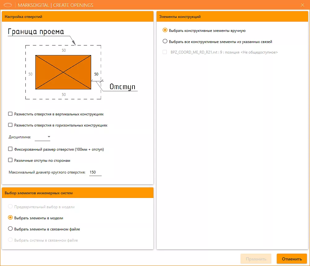 Про загрузку семейств из библиотек и работу с семейством отверстий см. пункт 2. 3 Раздела ОВ.