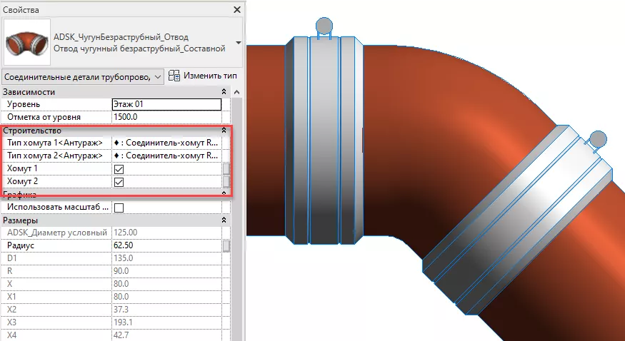 Параметр «Тип хомута 1» и «Тип хомута 2» - тип вложенного семейства хомута типа "Соединитель-хомут CV", "Соединитель-хомут Rapid", "Усиленный хомут CV", "Усиленный хомут Rapid".