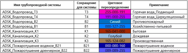 Для каждого типа трубопроводной системы используется цветовое переопределение, Таблица 24 - Трубопроводные системы.