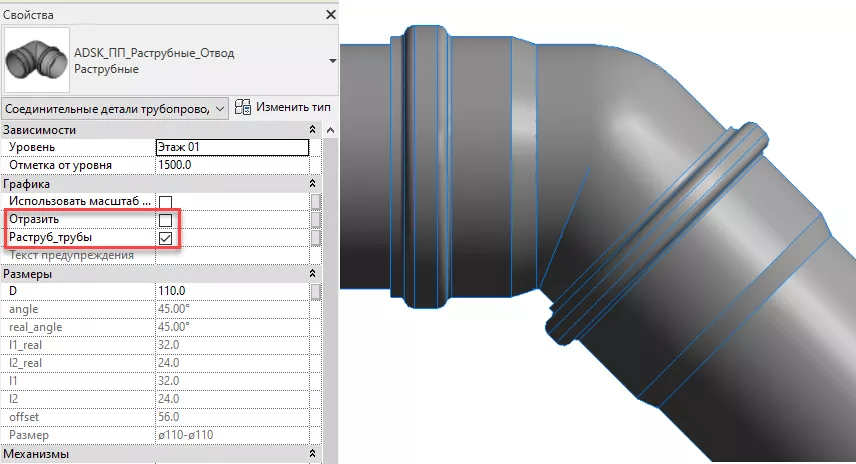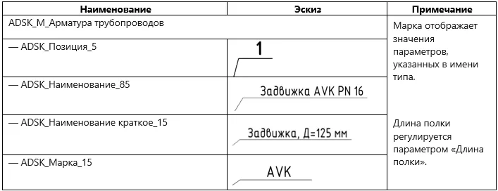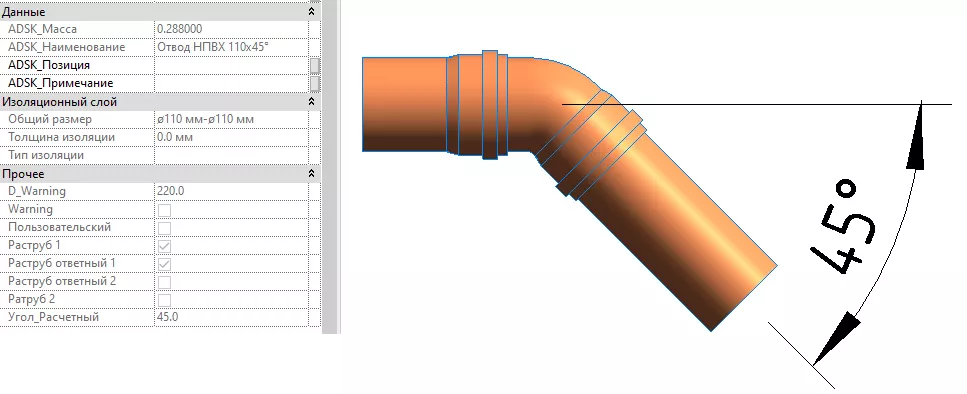 Все семейства соединительных деталей трубопровода настроены на автоматическое формирование значения общего параметра «ADSK_Наименование». Детали по ГОСТ имеют также заполненный параметр «ADSK_Код изделия». Во всех семействах добавлен общий параметр ADSK_Количество со значением 1. Данный общий параметр используется для формирования сводной спецификации по нескольким категориям.