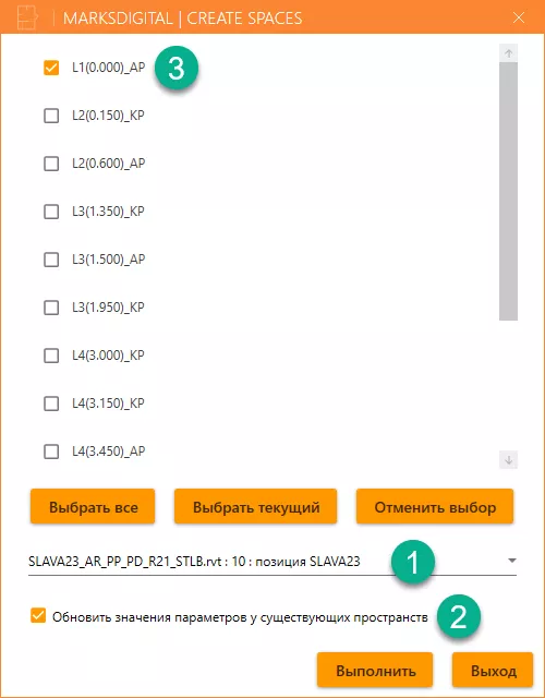 1 – Выберите связь откуда будут браться помещения2 – Если пространство было уже установлено, а значения параметров старые, то можно обновить значения параметров у существующих пространств
