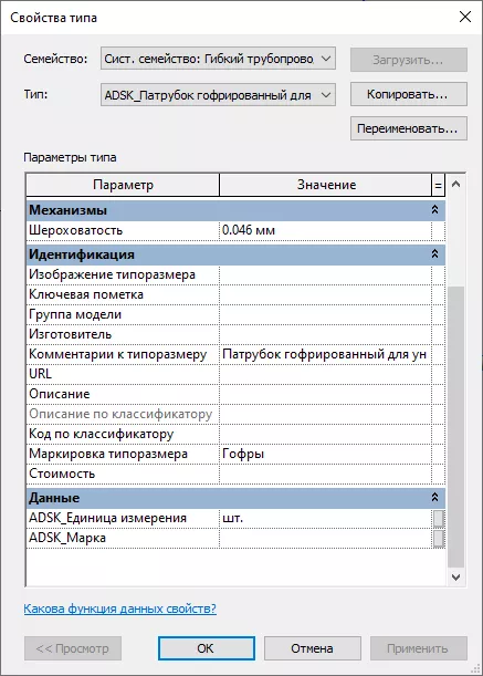 Для каждого типа гибкого трубопровода задан параметр «Комментарии к типоразмеру»: