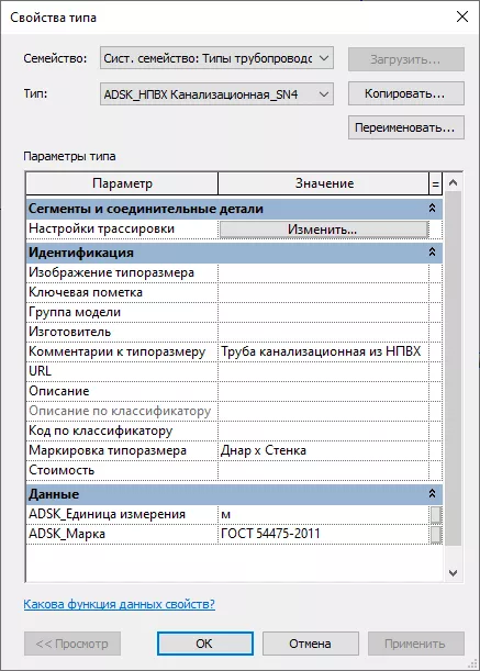 Для каждого типа трубопровода заданы значения общих параметров и стандартных параметров, Рис. 89 - Свойства типа.