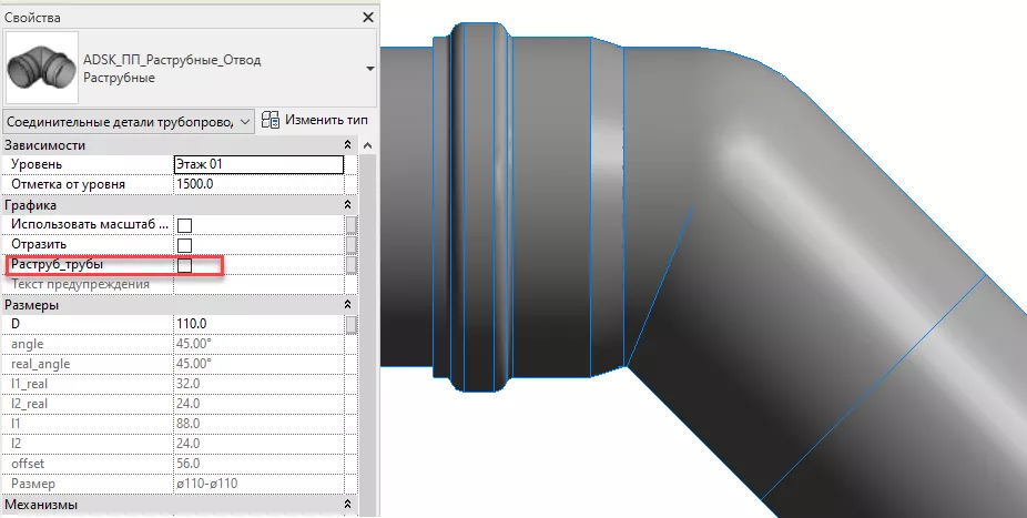 Параметр «Отразить» позволяет отзеркалить раструбное расположение элемента. Параметр «Раструб_трубы» позволяет скрыть или отобразить раструб подсоединенной трубы. Значение данного параметра также влияет на длину части элемента и расположение соединителя, Рис. 97 – Длина элемента.