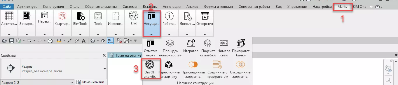 Для того чтобы плагин отработал необходимо найти на ленте вкладку «Marks» (1), перейти в раздел «Несущие конструкции» (2), в инструментах на текущей вкладке ленты, кликом правой кнопкой мыши выбрать «Переключить аналитику».