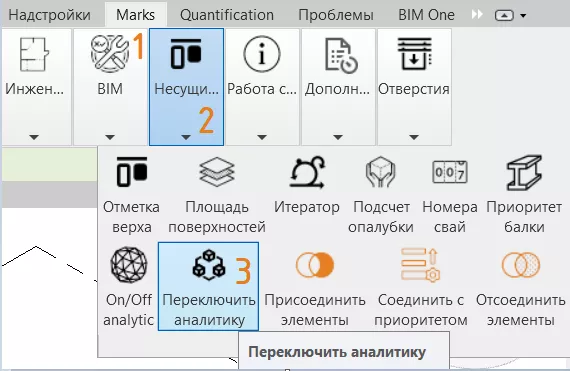 1. Инструмент «On/off analytic» находится на ленте Revit во вкладке Marks – Несущие конструкции.