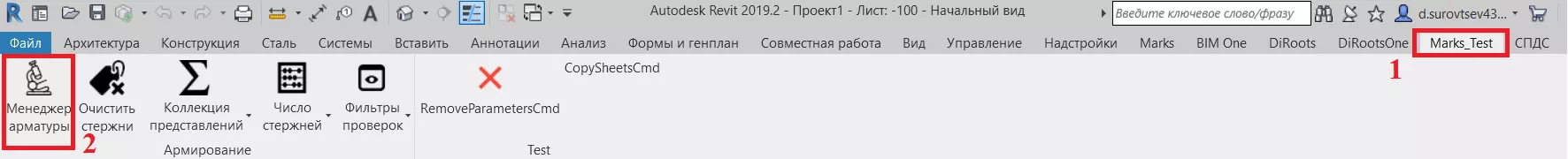 1. Для того чтобы начать работу с менеджером арматуры необходимо найти на ленте вкладку «Marks» и в инструментах, на текущей вкладке ленты, кликом правой кнопкой мыши выбрать «Менеджер арматуры».