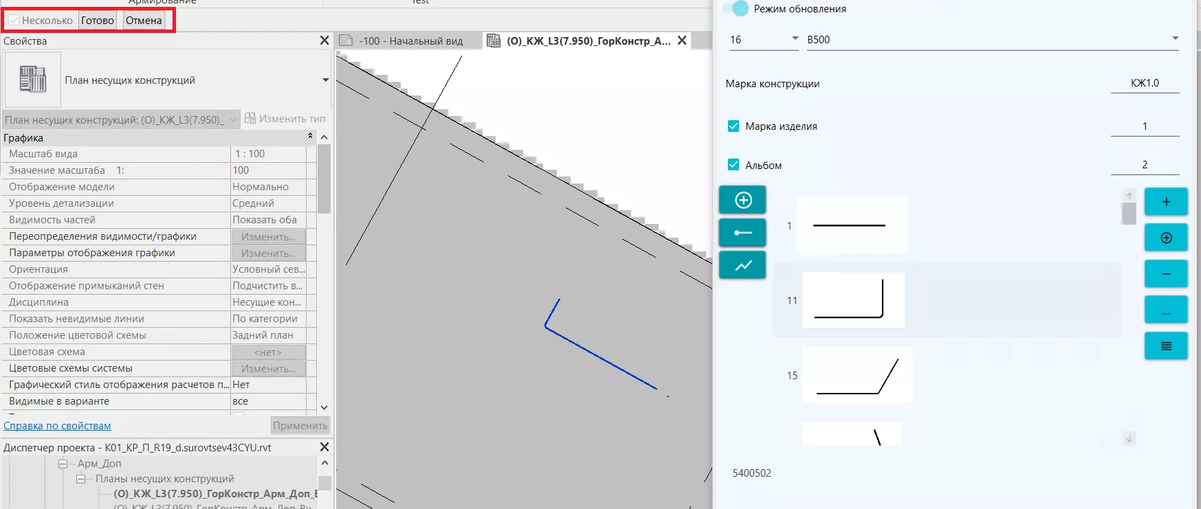 Рассмотрим работу менеджера арматуры на примере создания отдельного стержня. Поставим в плане Г – образный стержень, для этого: