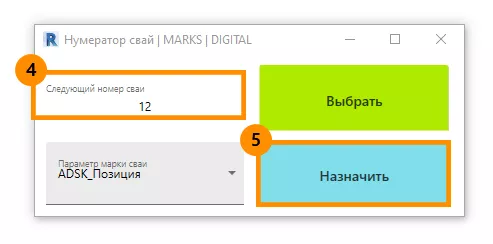 6) Нажмите кнопку «Назначить» (5) – см. Рисунок 7. Изменения вступят в силу, номер сваи запишется в параметр экземпляра ADSK_Позиция.