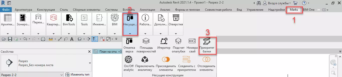 1. Инструмент «Приоритет балки» находится на ленте Revit во вкладке Marks – Несущие конструкции.
