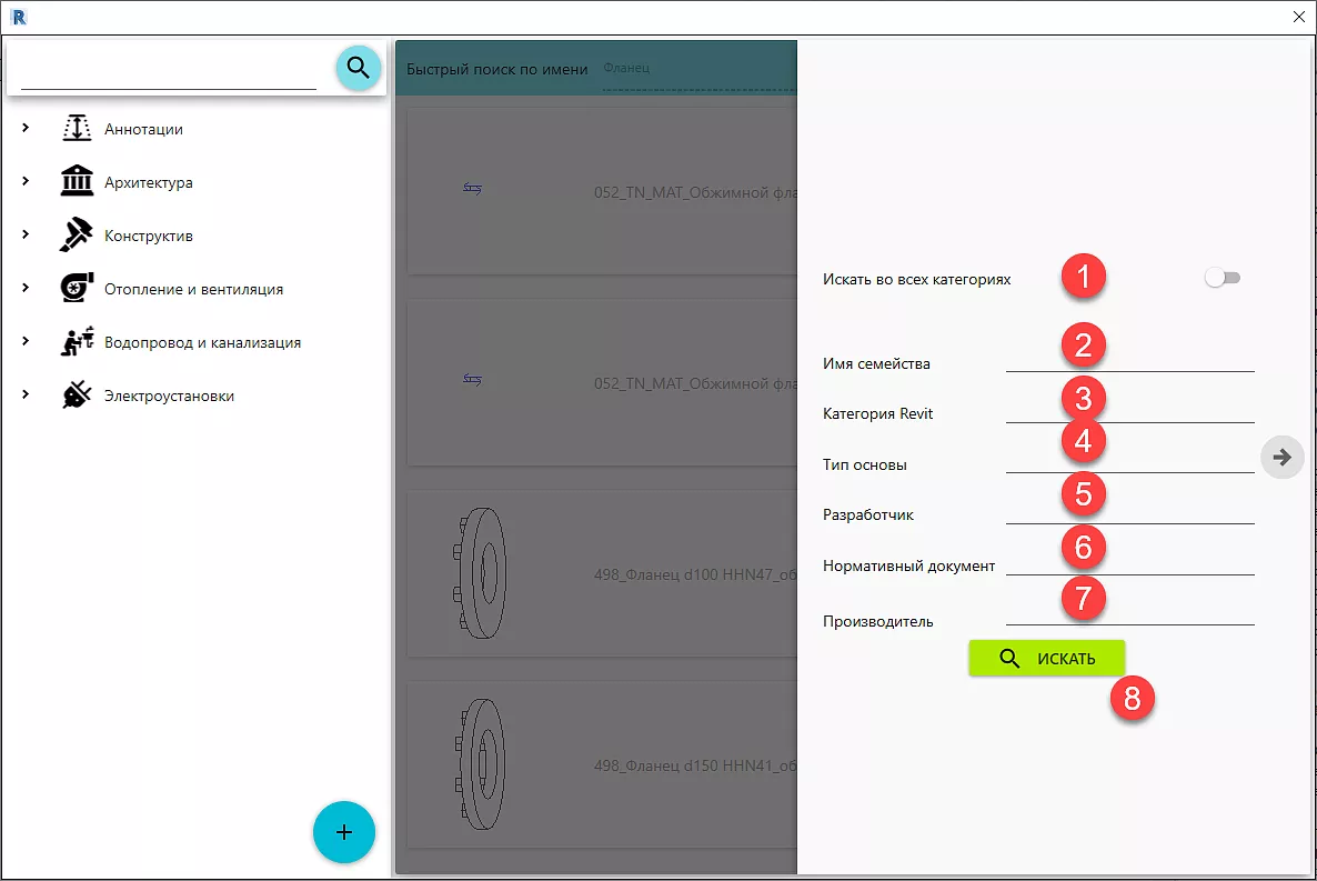 Поиск можно осуществлять сразу по несколько критериям [2] – [7]. Например, если ввести в Категорию Revit двери, то поиск найдет только двери. Или если вы знаете, что производитель Wilo, ты в поиск вы можете ввести данного производителя, Рис. 9 - Критерии расширенного поиска.