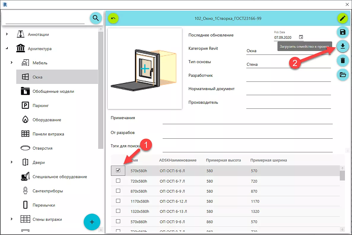Допустим, что вы архитектор, которому нужно добавить окно в проект. Для этого переходим в категорию Архитектура, выбираем подкатегорию окна, далее выбираем нужное окно.