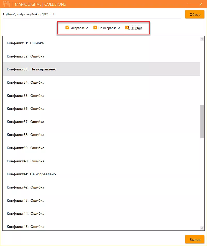 Конфликты можно фильтровать по статусам, например убрать все, кто имеет статус «Ошибка». Для этого необходимо снять галочку у фильтра «Ошибка», Рис. 5 - Фильтры коллизий.