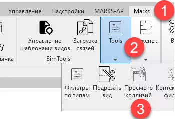 Затем переходим в Revit, открываем нужную модель для просмотра коллизий, подгружаем необходимые связи (те модели, с которыми есть пересечения). Во вкладке Marks переходим на Tools, и выбираем «Просмотр коллизий», Рис. 3 - Просмотр коллизий.