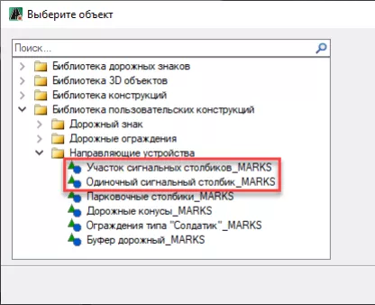 - По умолчанию сигнальные столбики моделируется из системной библиотеки конструкций. При моделировании сигнальных столбиков необходимо использовать пользовательскую библиотеку конструкций используя конструкцию «Участок сигнальных столбиков_MARKS» и «Одиночный сигнальный столбик_MARKS»;