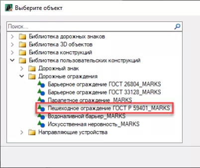 - По умолчанию пешеходное ограждение собирается из системной библиотеки конструкций. При моделировании барьерного ограждения необходимо использовать пользовательскую библиотеку конструкций используя конструкцию «Пешеходное ограждение_MARKS»;