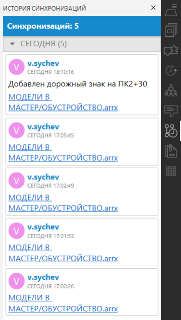 Вся история синхронизаций в проекте отображается на боковой панели «История синхронизаций»