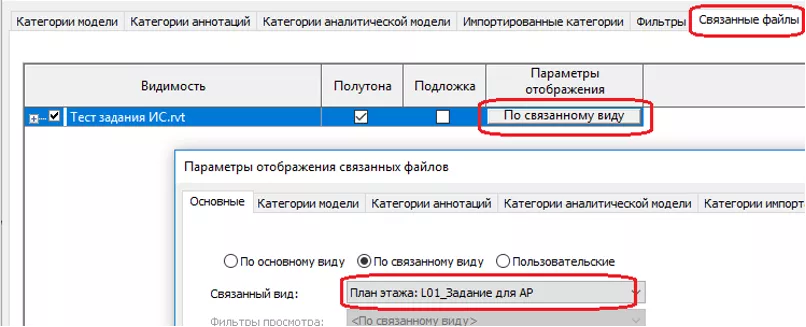 В большинстве случаев при передаче задания требуется указать текстовые примечание, выноски, указания — информацию, которую не представляется возможным передать в 3D-модели. Для решения данной задачи следует использовать функционал Revit по отображению аннотативных элементов из связанных файлов при помощи отображения «По связанному виду». Передавать оформленные задания в виде DWG-файлов или «на бумаге» не допускается.