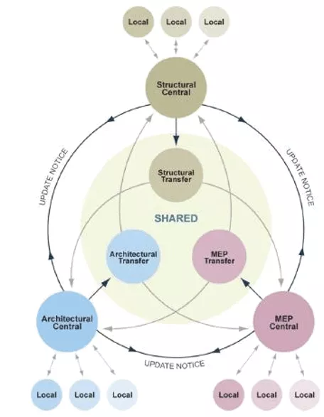 Несмотря на то, что по идеологии информационного моделирование предусматривается разработка проекта всеми участниками в единой среде, на практике это часто оказывается невозможным ввиду ограниченности доступных в настоящее время аппаратных ресурсов, а также ввиду организационных ограничений. По этой причине, как правило, проект здания разрабатывается как несколько моделей Revit, связанных друг с другом. При изменении одной из моделей изменения будут отображены в других файлах.