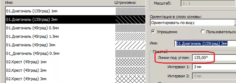 - Имя типа - соответствует типу штриховки или типу материала, например “Диагональ”, “Крест”, “Бетон”, “Грунт”.