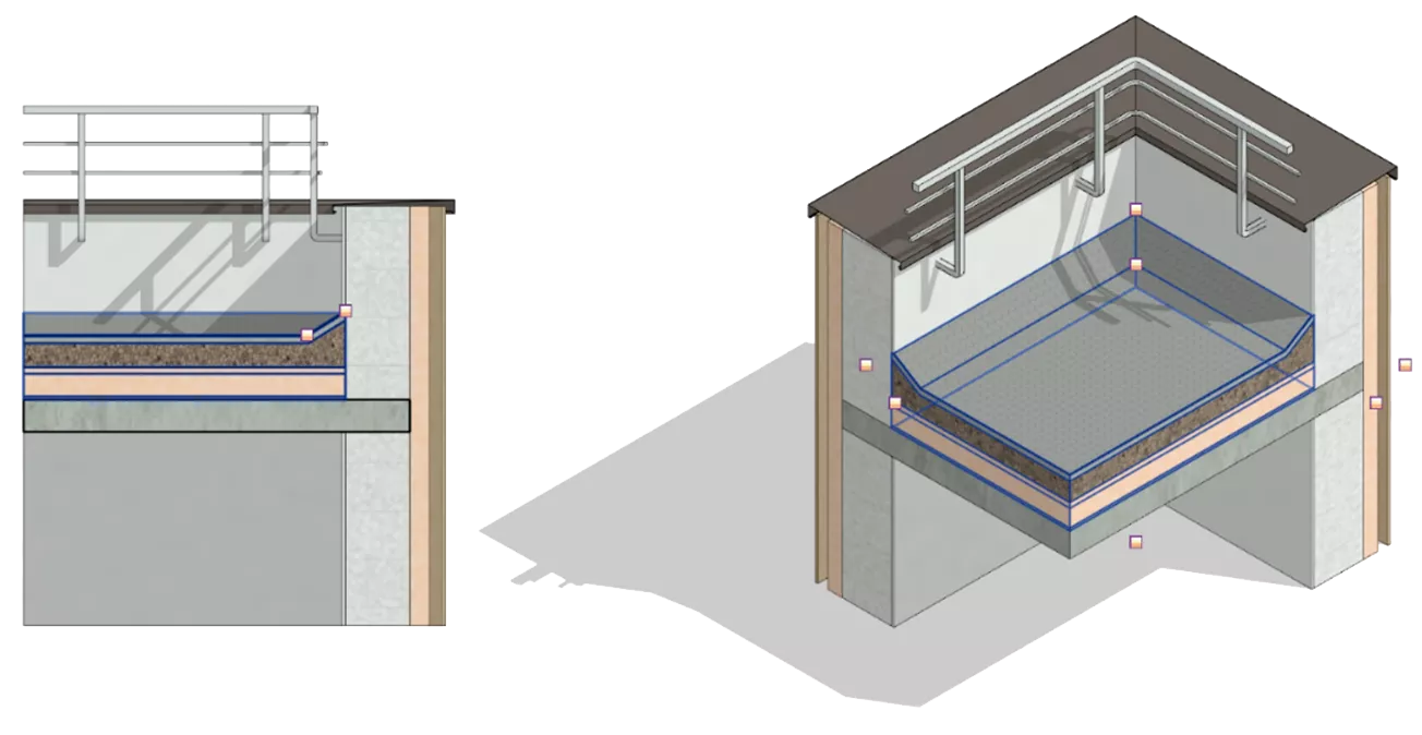 Выполняется: • Путем моделирования с уклонами в виде многослойной структуры на уровнях кровли. Допускается моделирование основных слоев с заполнением точного состава кровли в параметр «MARKS_Состав конструкции» • Заполнение параметров, необходимых для формирования сводной ведомости объемов работ. |