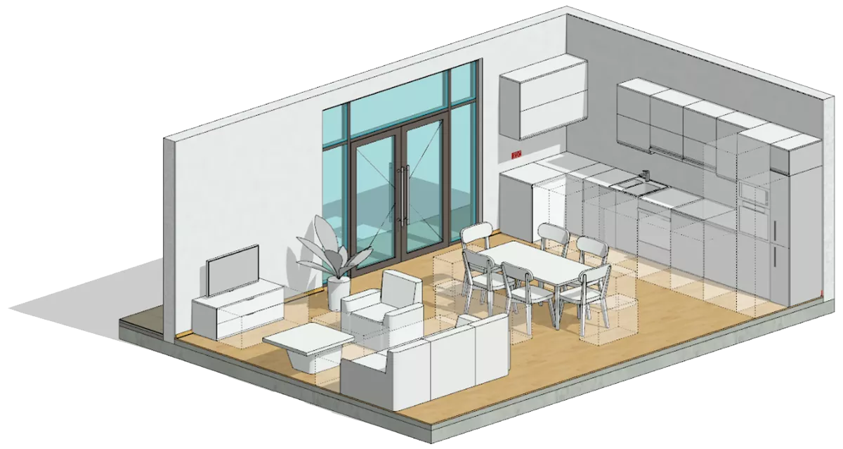 Выполняется: • Моделирование отдельными элементами в точном расположении и габаритах каждого помещения в объеме всего здания. Сантехнические приборы и бытовая техника может моделироваться с необходимыми соединителями для подключения к необходимым системам. • Заполнение параметров, необходимых для формирования сводной ведомости объемов работ. |