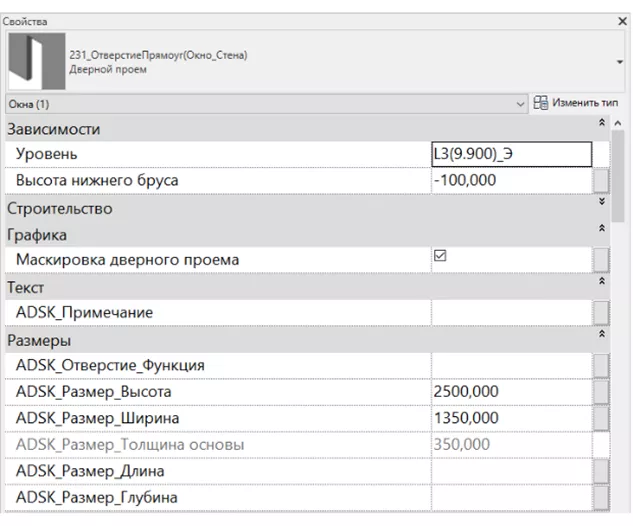 Выполняется: • Проемы моделируются в точных габаритах и точном расположении в объеме всего здания; • Заполнение параметров. |