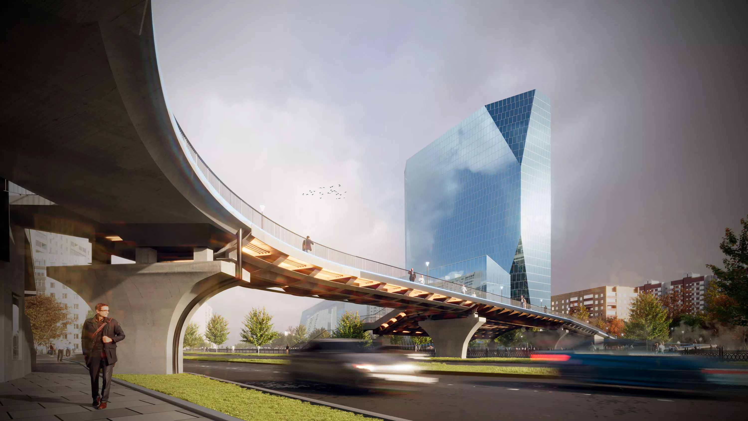 С восточной стороны съезд с моста закручивается в форму, напоминающую ленту мёбиуса, в центре которой предполагается разместить зону активного отдыха студентов - скейтпарк.